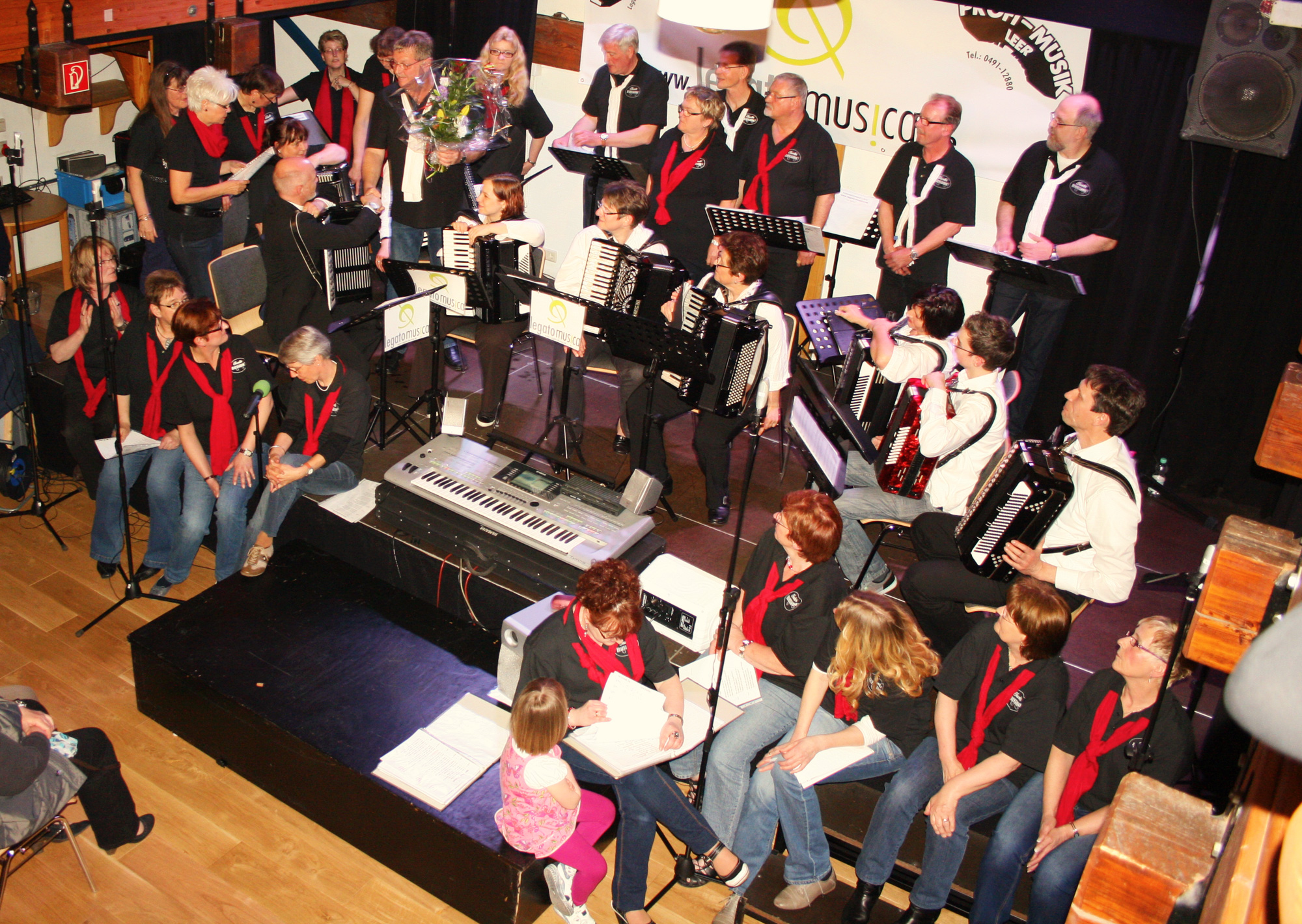Nach den ersten 40 Minuten wurde der Chor erstmals von der Solistengruppe des Akkordeon-Orchester der Stadt Leer e.V. abgelöst, die ebenfalls begeistert mit Applaus begrüßt wurde. Nach der beliebten Vegelin Suite von Jacob de Haan und einem Tango wurde u.a. auch ein Medley mit bekannten „Romantic Melodies“ sowie „Memory“ aus Cats vom Orchester aufgeführt, was nicht nur die Gäste, sondern auch den wartenden Chor zum Mitsummen animierte. Zwischenzeitlich tauschten Chor und Orchester erneut die zentrale Rolle und boten so ein abwechslungsreiches Programm mit Klassikern wie „Sieben Brücken“, „Über den Wolken“ oder auch „Happy Heart“ von James Last.
